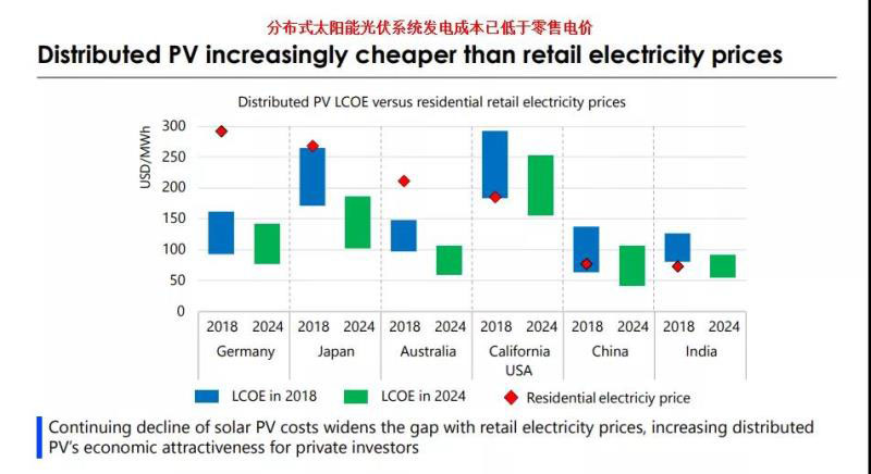 在大多數(shù)國家,使用分布式太陽能光伏系統(tǒng)發(fā)電的成本已經(jīng)低于零售電價。IEA預(yù)測,到2024年,這些成本將進一步下降15%至35%,這將使該技術(shù)更具吸引力,并推動全球范圍內(nèi)的采用。