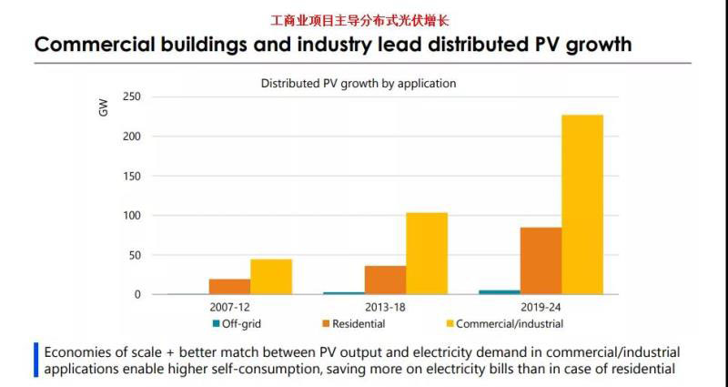 到2024年,分布式光伏將占整個太陽能光伏市場增長的近一半。與傳統(tǒng)觀點相反的是,在未來五年分布式光伏的發(fā)展中,工商業(yè)光伏項目將以四分之三的份額占據(jù)分布式光伏新增量的主導(dǎo)地位,而不是住宅屋頂項目。這是因為,規(guī)模經(jīng)濟能與光伏供應(yīng)和電力需求的更好協(xié)調(diào)相結(jié)合,更大的自用比例,可以為工商業(yè)企業(yè)節(jié)省更多的電費。