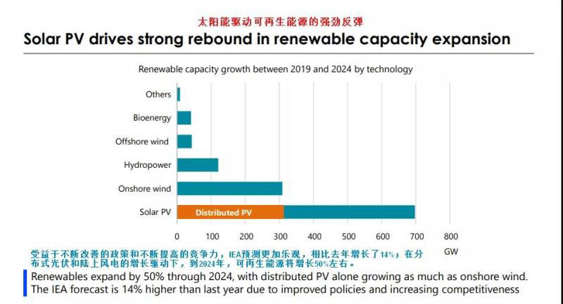 報告預(yù)測,2019年至2024年期間,全球可再生能源裝機量將達到1200GW,增長50%;可再生能源在全球發(fā)電中的比重將從今天的26%上升到2024年的30%。其中,光伏將占新增裝機中的60%左右。