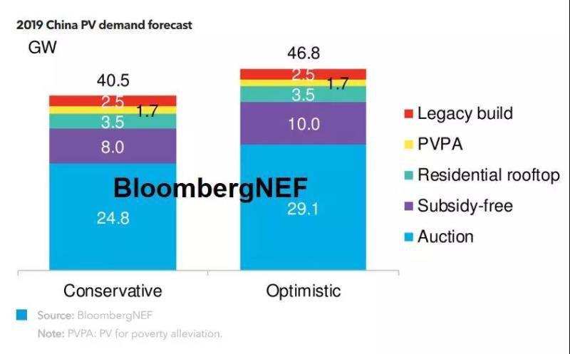 中國2019年光伏政策驅(qū)動市場向兩個方向發(fā)展,一方面積極推進平價項目的開發(fā),另一方面將于年中開展大規(guī)模競價,分配補貼。BNEF預測,2019年,中國光伏新增裝機容量將在41GW至47GW之間,這將使得下半年全球光伏組件價格維持在穩(wěn)定水平。