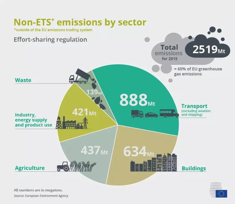 歐盟國家的溫室氣體排放限制是在兩個不同的框架內(nèi)設(shè)定和實施的,即所謂的“碳排放交易體系”(ETS)和“非ETS”部門。2015年非ETS部門排放高達(dá)25.19億噸(約占?xì)W洲碳排放的60%),其中交通8.88億噸、建筑6.34億、農(nóng)業(yè)4.37億噸、中小型工業(yè)4.21億噸、垃圾1.39億噸。