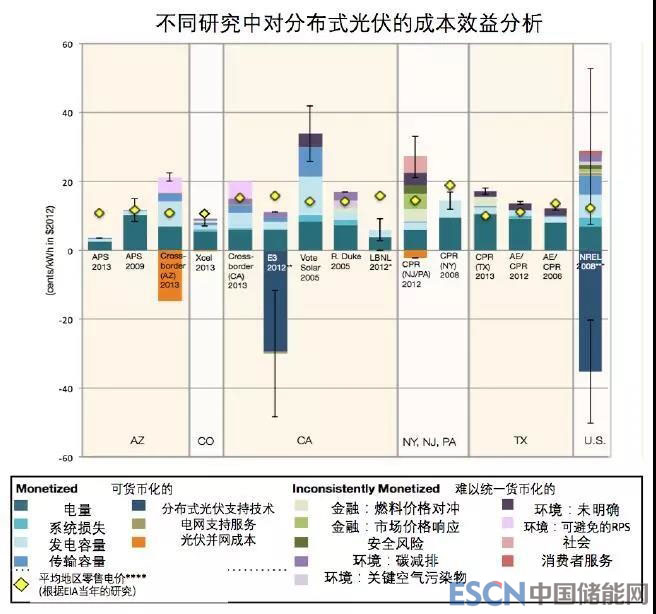 因此,美國目前面臨兩大挑戰(zhàn):確定分布式發(fā)電為電網提供了哪些價值;以及這些價值應該如何評估和補償。目前一些比較公認的分布式發(fā)電價值(對用戶、電網和社會)在下圖三中有具體展示。美國很多研究機構都在嘗試采用不同的方法對分布式光伏的價值進行成本效益分析。圖四中展示了各項主要研究對于應包含的屬性和其價值的分析結果。其中可以看出,對于價值估算的方法學和結果差距最大的部分為: