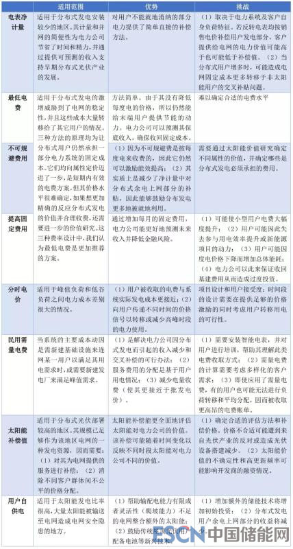 然而,一個更精細的電費機制并不一定是更好的選擇,對于電費和補償設置應進行更綜合全面的考慮。在下表中,我們對各常用的分布式能源資源電費和補償機制的適用范圍、優(yōu)勢和挑戰(zhàn)進行了更為詳細的比較,為監(jiān)管方提供參考: