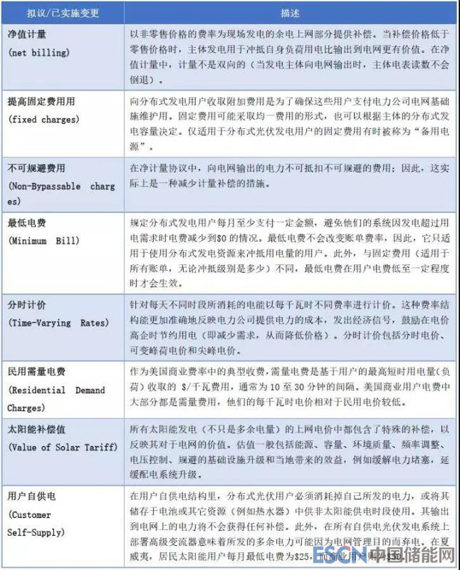 面對分布式發(fā)電體量的不斷增加及電表凈計量方式暴露的問題,美國已經開始探索更為精細的分布式發(fā)電補償費率。下表中是美國可再生能源國家實驗室(NREL)整理出的一些已經實施或正在考慮的費率改革選項: