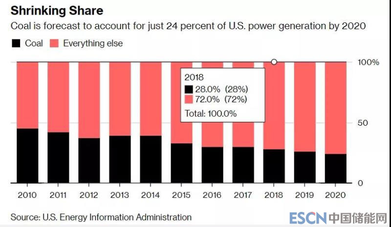 中國儲能網訊:根據彭博社轉引美國能源信息署的數據,2010年美國煤電比例為45%,此后逐年下降。2017年煤電比例為30%,2018年進一步下跌至28%。2018年美國有18座煤電廠退役,創(chuàng)造歷史上煤電退役的最高水平;預計2019年仍將有14座煤電廠退役。美國能源信息署預測,2020年美國煤電比例僅剩24%。