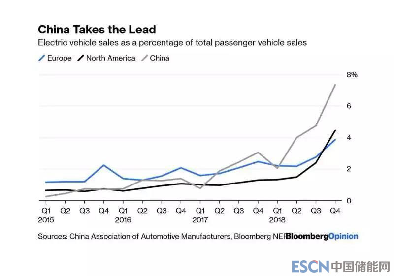 2018年新能源汽車在中國銷售的2810萬輛汽車中僅占4%,但這個比率高于美國(低于2%)和歐洲(略超3%)。自2015年以來,中國電動汽車銷量一直超過美國,而且差距在拉大。2018年中國電動汽車銷量已經(jīng)是美國的三倍,預(yù)計2019年中國新能源汽車銷量可達160萬輛。