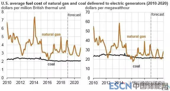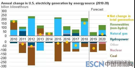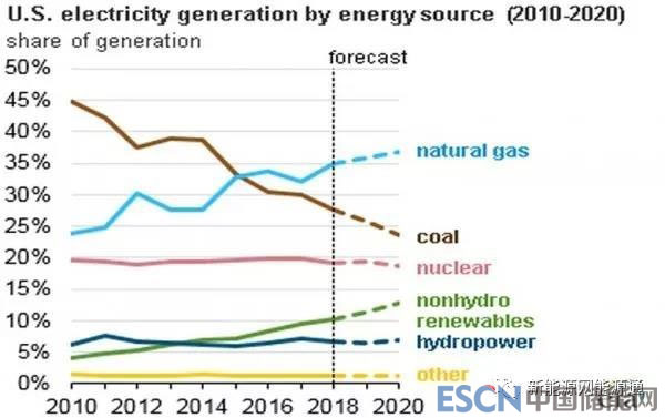 即使可再生能源的增長,化石燃料仍將為美國提供大部分電力。2018年,煤炭和天然氣合計提供了63%的電力,EIA預(yù)測2020年將提供61%。