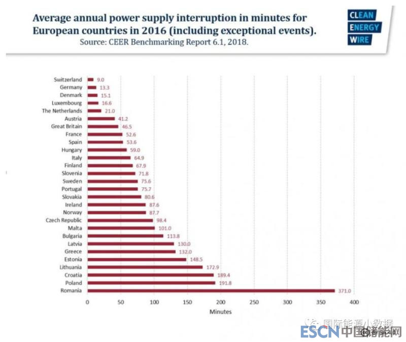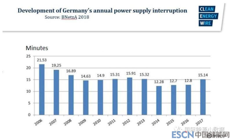 根據(jù)歐洲能源監(jiān)管委員會(huì)(CEER)的數(shù)據(jù),德國的電力供應(yīng)安全是歐洲最好的。在CEER 2018年2016年數(shù)據(jù)的比較中,德國的SAIDI得分(包括特殊中斷)在歐盟排名第二,略低于瑞士。相比之下,英國,法國和西班牙每年都有大約50分鐘的中斷時(shí)間。羅馬尼亞的中斷時(shí)間最長,平均為371分鐘。在全球范圍內(nèi),德國的表現(xiàn)也非常好。根據(jù)美國能源信息署(EIA)的數(shù)據(jù),2016年美國公民平均“在一年中沒有電力四小時(shí)”。在西澳大利亞州的三個(gè)電網(wǎng)中,2016 - 17年SAIDI得分分別為233分,1077分和343分。
