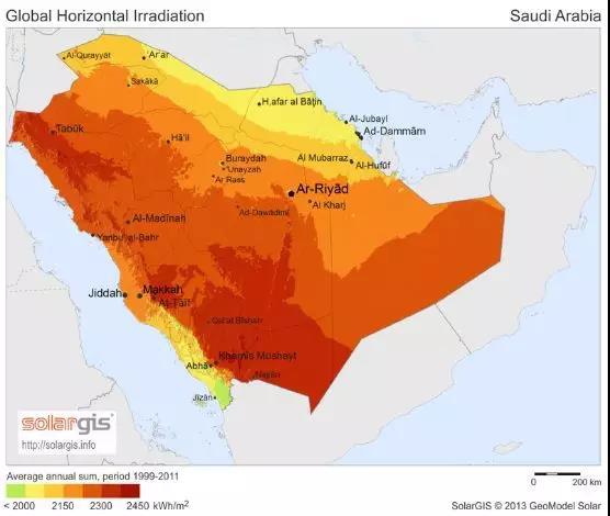 除卻以上因素,沙特國內(nèi)本身的自然地理條件也為其未來大力發(fā)展太陽能打下了很好的客觀基礎(chǔ)。沙特國土面積一半以上是沙漠,干燥少雨,太陽輻射非常高,太陽能資源相當(dāng)豐富。除此之外,低廉的沙漠地價以及太陽能項目建設(shè)成本也使得沙特太陽能產(chǎn)業(yè)的推行愈發(fā)可行。