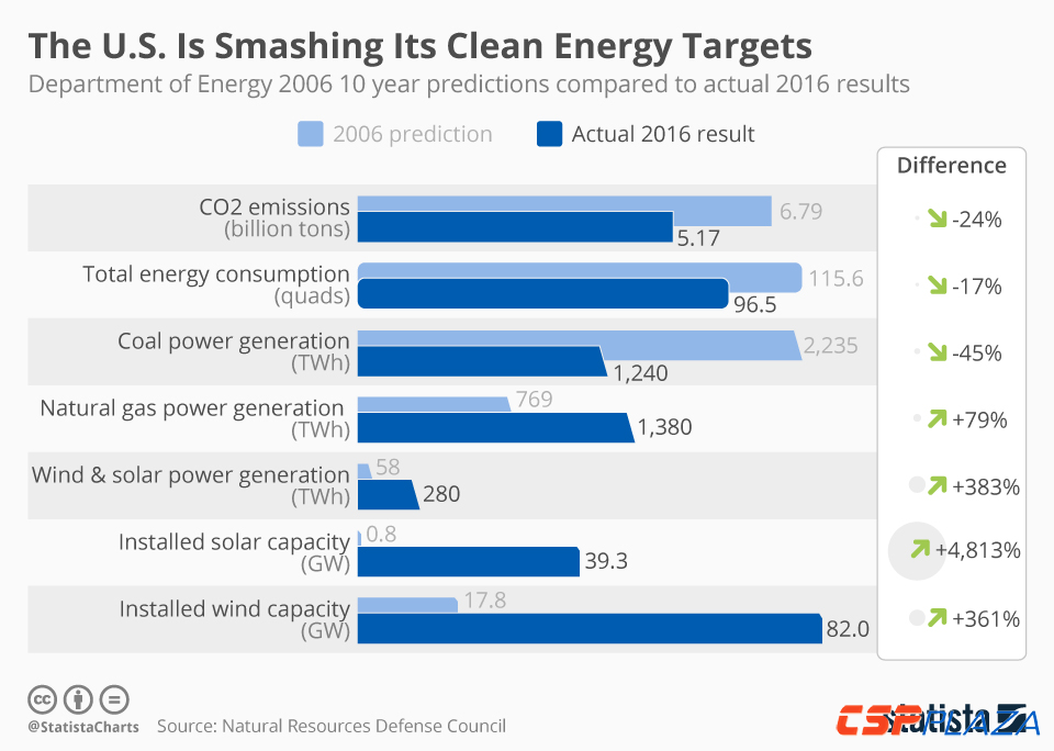 美國(guó)數(shù)據(jù)供應(yīng)商Statista稱,2016年,二氧化碳實(shí)際排放,比十年前的預(yù)期少了24%。煤炭發(fā)電量比預(yù)期的要低45%,而天然氣發(fā)電比預(yù)期的高出79%。