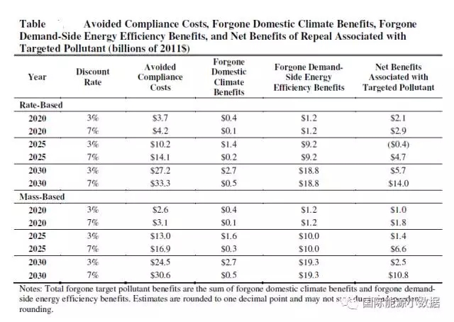 如下表所示,在污染物(包括二氧化碳)總量控制(mass based)目標(biāo)情境下,如果折現(xiàn)率為7%,那么執(zhí)行清潔電力計劃所帶來的美國本土排污收益損失為每年5億美元、需求側(cè)能效改善收益為193億美元,二者合計收益為198億美元;然而,執(zhí)行清潔電力計劃本身所需要的投資成本高達(dá)306億美元。這樣,把成本與收益相抵,取消清潔電力計劃還可以“節(jié)省”108億美元。即便在折現(xiàn)率為3%的假設(shè)下,那么取消清潔電力計劃仍有25億美元的凈“收益”。