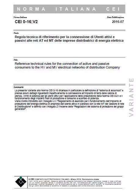 2016年8月,意大利電氣技術委員會發(fā)布了新的中高壓并網(wǎng)標準修訂版CEI 0-16 V2:2016-07。新版的中高壓并網(wǎng)標準修訂版CEI 0-16 V2:2016-07更新了系統(tǒng)并網(wǎng)保護限值。
