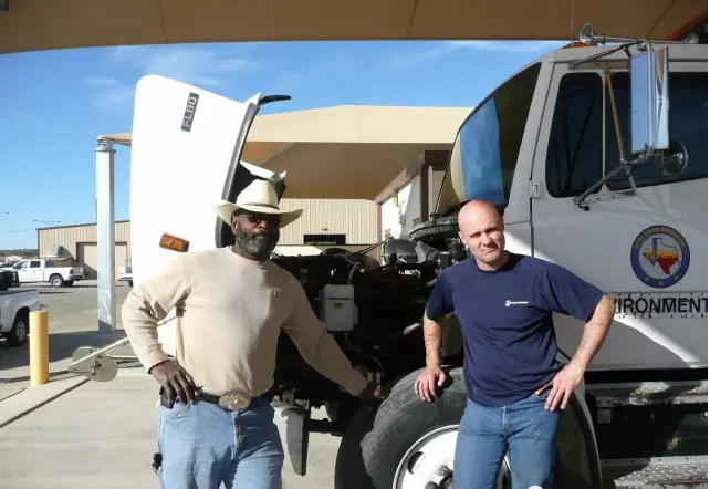 托德福勒被邀請在得克薩斯州的胡德堡陸軍基地進行氫氣示范。證明是一個有成效的顯著的改善。最高青蛙柴油,當(dāng)?shù)氐腃AT陸軍合約工程師(左))進行了演出演示,并記錄了里程上的改善。