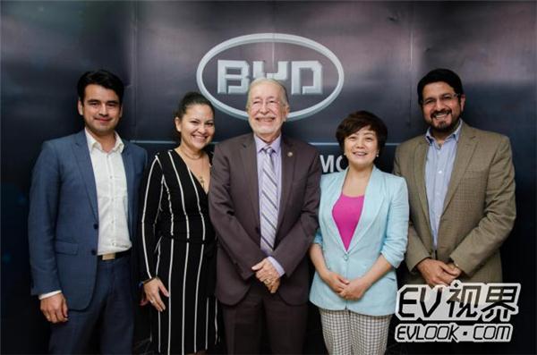 厄瓜多爾國家工業(yè)生產(chǎn)部部長Santiago León先生(右一),比亞迪高級副總裁李柯女士(右二)與參會嘉賓合照