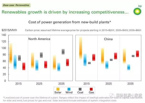 BP對(duì)可再生能源的發(fā)展前景的預(yù)測(cè)與其對(duì)可再生能源成本的判斷相關(guān)。以中國(guó)為例,如果考慮碳價(jià)20美元/噸,2015年新建煤電廠的平準(zhǔn)成本在5-6美分/千瓦時(shí),明顯低于光伏(7-13美分/千瓦時(shí))、風(fēng)電(5-8美分/千瓦時(shí))、天然氣發(fā)電(6-8美分/千瓦時(shí))。到2035年,即便考慮碳價(jià)60美元/噸,當(dāng)年新建煤電廠的平準(zhǔn)成本在7-8美分/千瓦時(shí),依然低于光伏(5-9美分/千瓦時(shí))、天然氣發(fā)電(7-9美分/千瓦時(shí)),只有風(fēng)電成本(3-5美分/千瓦時(shí))屆時(shí)會(huì)低于煤電。