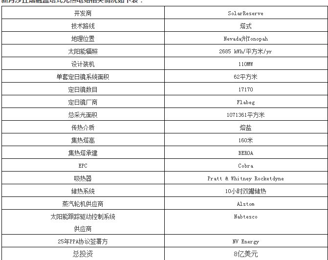 據悉,新月沙丘電站總投資額8億美元,曾獲得美國能源部提供的7.37億美元貸款擔保支持。SolarReserve、ACS Cobra和Santander銀行參與了部分項目投資。內華達州最大的電力公司NV Energy公司為該電站的電力承購方,PPA協(xié)議購電年限為25年,協(xié)議電價僅為0.135美元/KWh。