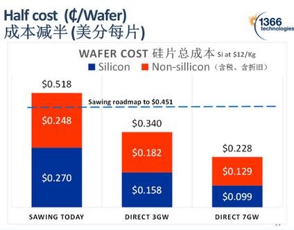 如上圖所示,那條藍色的線就是多晶金剛線切割所達到的成本極限,1366科技認為,當(dāng)產(chǎn)量達到3GW時采用直接法硅片技術(shù),硅成本可達$0.158/片,當(dāng)產(chǎn)量達到7GW時,硅成本達到$0.099/片。直接法硅片技術(shù)為延續(xù)多晶的市場主導(dǎo)地位提供了一種成本極低的選擇。