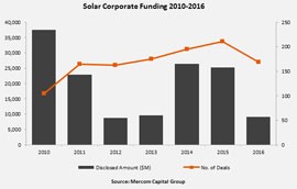 Mercom Capital集團(tuán)首席執(zhí)行官兼聯(lián)合創(chuàng)始人Raj Prabhu評(píng)論道:“對(duì)于太陽能企業(yè)而言,今年是籌資充滿挑戰(zhàn)的一年,即使需求預(yù)期達(dá)到歷史新高。2017年可能比預(yù)期情況要好,因?yàn)榻M件價(jià)格降低預(yù)計(jì)將提升裝機(jī)量?!?