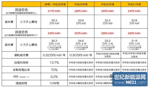 另外,自下年度起,將每次性確定3年的住宅用系統(tǒng)收購價格。無設置輸出功率控制設備義務的系統(tǒng),2017年度為28日元/kWh,2018年度為26日元/kWh,2019年度為24日元/kWh;有設置義務的系統(tǒng)在此基礎上分別高2日元。