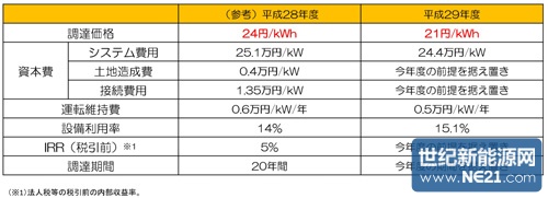 非住宅用系統(tǒng)的收購價格從本年度的24日元/kWh,降到了21日元/kWh。作為計算前提的成本和設備利用率,系統(tǒng)費用從25.1萬日元/kW降至24.4萬日元/kW,設備利用率則從14%提高到15.1%,成為了下調(diào)價格的依據(jù)。