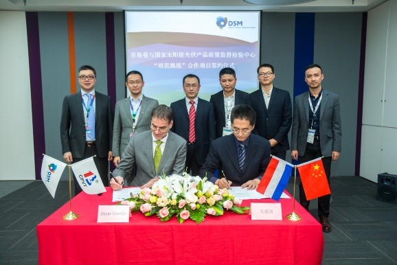 帝斯曼先進(jìn)表面副總裁Oscar Goddijn與國(guó)家太陽(yáng)能光伏產(chǎn)品質(zhì)量監(jiān)督檢驗(yàn)中心吳建國(guó)主任“明思挑戰(zhàn)”簽約現(xiàn)場(chǎng)。