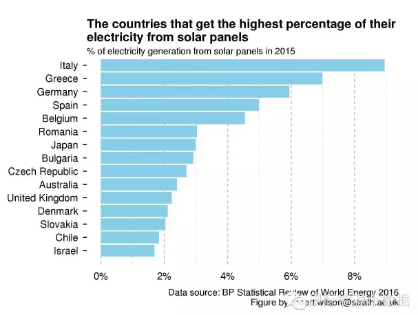 但是,如果我們從各國光伏發(fā)電占總發(fā)電量的比例來看,2015年意大利光伏發(fā)電占總發(fā)電量比例接近9%,這個(gè)比例在世界上名列前茅。2015年光伏發(fā)電比例排在前十名的其他國家是希臘(約7%)、德國(約6%)、西班牙(約5%)、比利時(shí)(約4.5%)、羅馬尼亞(約3%)、日本(約3%)、保加利亞(約3%)、捷克(約2.7%)、澳大利亞(約2.5%)。