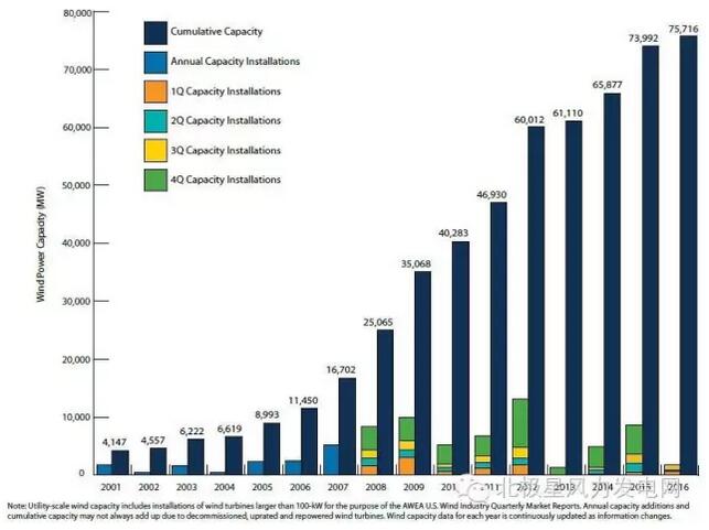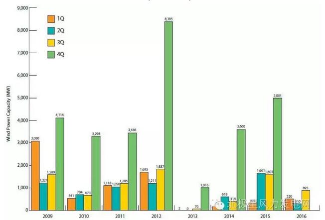 美國(guó)風(fēng)電新增裝機(jī)量2009-2016(按季度)