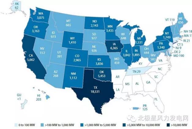 美國(guó)風(fēng)電各州分布情況