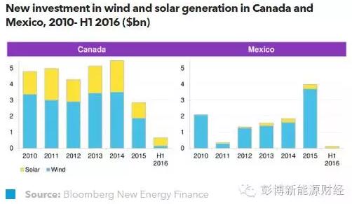 2016年上半年,在經(jīng)過2010到2014年的平穩(wěn)期后,加拿大風(fēng)電和光伏領(lǐng)域的新投資在2015年急劇下降。預(yù)計(jì),2016年的投資額將再次下跌。2015年,墨西哥可再生能源產(chǎn)業(yè)共吸引了創(chuàng)紀(jì)錄的40億美元,展示了相當(dāng)不錯(cuò)的潛力,但2016年初的投資情況未能繼續(xù)保持良好勢頭。