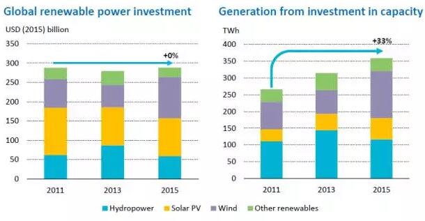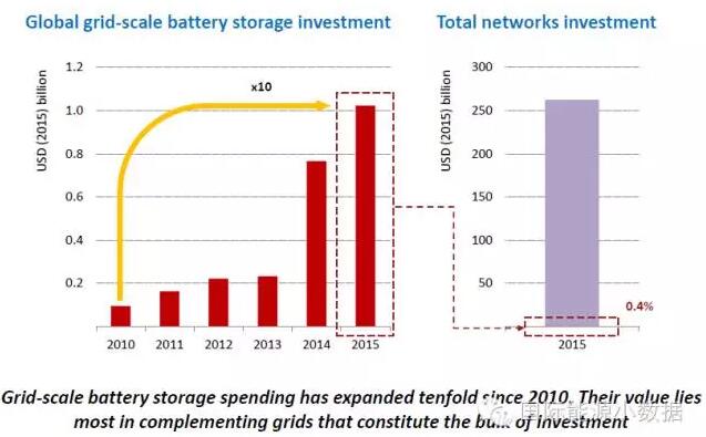 特別值得一提的是,2011年以來(lái)全球在可再生能源發(fā)電投資基本平穩(wěn),但是由于可再生能源成本的下降,每年新增的可再生能源發(fā)電量逐年增加,2015年超出2011年33%。此外,電力儲(chǔ)能投資2015年超過(guò)100億美元,是2010年的10倍;但是儲(chǔ)能投資僅占電網(wǎng)投資的0.4%,還有很長(zhǎng)的路要走。