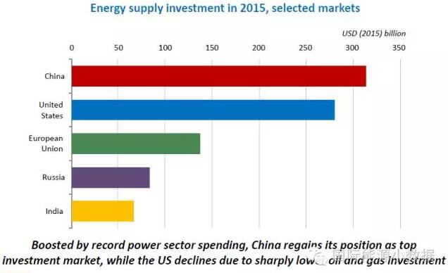 2015年中國(guó)能源領(lǐng)域總投資為3150億美元,占全球能源總投資的17%,是世界上第一能源投資大國(guó),遠(yuǎn)超位居第二的美國(guó)(2800億美元)。在中國(guó)能源投資中,有900億美元用于可再生能源發(fā)電;450億美元用于化石能源電廠(主要是煤電廠,2015年新增煤電裝機(jī)接近45吉瓦)。