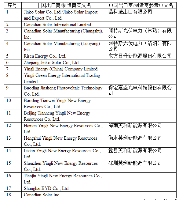 中國儲能網(wǎng)訊:2016年9月7日,美國商務(wù)部發(fā)布公告稱,部分取消對華晶體硅光伏產(chǎn)品的調(diào)查期為2014年7月31日~2016年1月31日的反傾銷行政復(fù)審。美國商務(wù)部本次撤銷行政復(fù)審調(diào)查的27家中的18家中國涉案企業(yè)名單詳見下表。