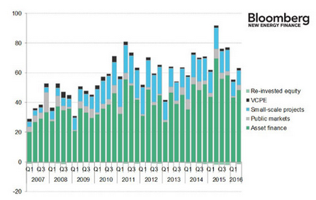 2016年第二季度的清潔能源相關(guān)投資為615億美元,比第一季度增長了約12%,但與極為堅(jiān)挺的上年同期相比則減少了32%。