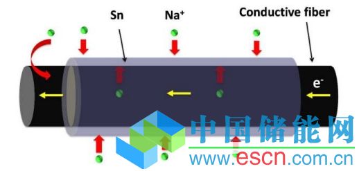 他們使用黃松木薄片進行測試。先用奈米碳管覆蓋在薄片之上以改善其傳導(dǎo)性,接著再在每塊薄片上加上一層錫;完成之后,將薄片放入含有鈉離子的電解液中,進行400次循環(huán)的充放電??刂平M則是以銅薄片制成的類似電池。