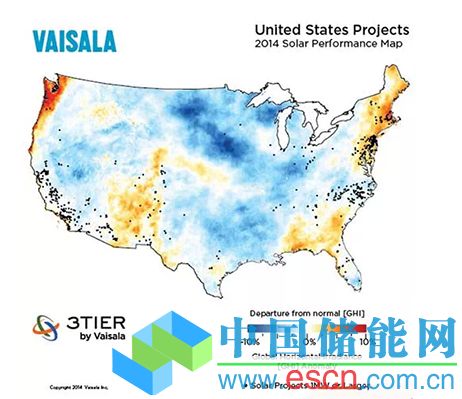 首先是糟糕的天氣。下圖可見(jiàn),加州南部和內(nèi)華達(dá)州2014年的輻照水平與過(guò)去15年的平均數(shù)據(jù)相比產(chǎn)生了很大的偏離。Ivanpah項(xiàng)目位于加州南部靠近內(nèi)華達(dá)的邊界位置,正好是在地圖中的藍(lán)色部分。