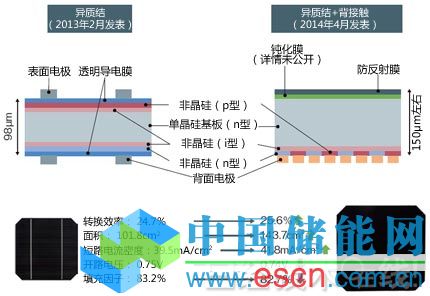 而此次松下首次采用了保留部分異質(zhì)結(jié)、去掉受光面電極的“背接觸結(jié)構(gòu)”。由于去掉了遮擋光線的電極,因此能夠增加電流量。實(shí)際上,作為電流值目標(biāo)的短路電流密度較該公司2013年2月發(fā)布的異質(zhì)結(jié)單元得到提高(圖2)注2)。在利用異質(zhì)結(jié)保持高電壓的同時(shí),通過(guò)背接觸結(jié)構(gòu)增加電流的手法為實(shí)現(xiàn)25.6%的轉(zhuǎn)換效率做出了貢獻(xiàn)。