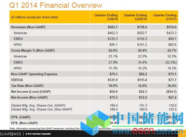 SunPower報(bào)告,2014年第一季度 GAAP收入為6.924億美元,較前一季度6.381億美元有所提高。GAAP毛利率為23.5%,較2013年第四季度20.5%大幅提高。凈利潤(rùn)為6500萬(wàn)美元。