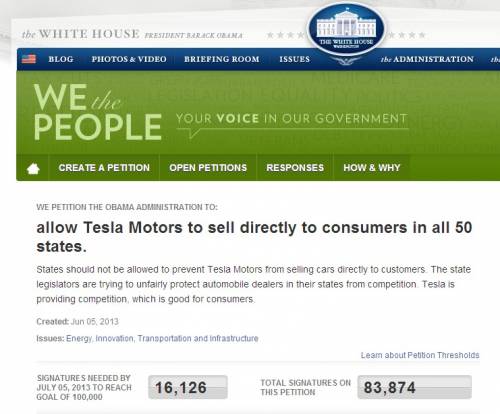 據(jù)autobloggreen網(wǎng)站報道,一名男子于6月5日在白宮網(wǎng)站發(fā)起了一封請愿書,聲稱某些州政府以不公正途徑阻撓特斯拉直銷電動汽車,以保護當?shù)氐钠嚱?jīng)銷商免受競爭。目前,該請愿書已經(jīng)獲得83874人支持,如果簽名人數(shù)達到10萬,白宮就必須對此作出回應(yīng)。