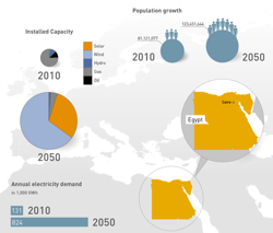 到2020年,可再生能源發(fā)電量將占埃及發(fā)電總量的20%。(如上圖)為了滿足該國(guó)快速增長(zhǎng)的電力需求量,風(fēng)電或許將扮演一個(gè)重要的角色。Dii 財(cái)團(tuán)預(yù)計(jì),到2050年,可再生能源發(fā)電量將增長(zhǎng)6倍,超過(guò)800TWh。同期,埃及人口數(shù)量可能將從8000萬(wàn)人增長(zhǎng)至1.20億人。
