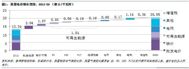 彭博新能源財(cái)經(jīng)的分析顯示,從目前到2020年之間英國(guó)家庭電費(fèi)預(yù)測(cè)增量的40%將歸因于低碳政策(包括從2013年4月起推出的碳價(jià)下限以及可再生能源補(bǔ)貼)。