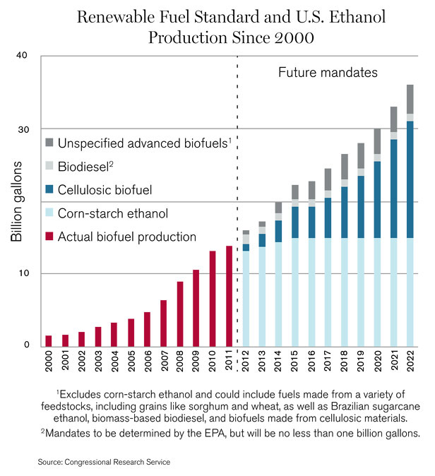 目前所生產(chǎn)的生物燃料,絕大部分是從玉米提煉出來的乙醇,對此,《可再生燃料標(biāo)準(zhǔn)》設(shè)定了限制,就是到2015年限制在150億加侖。因此,為了滿足聯(lián)邦政府的規(guī)定,到2022年,使360億加侖的生物燃料進(jìn)入整體供應(yīng),美國生物燃料產(chǎn)業(yè)就必須生產(chǎn)大量其他類型的生物燃料,尤其是纖維質(zhì)乙醇,都要用木屑和草進(jìn)行提煉。