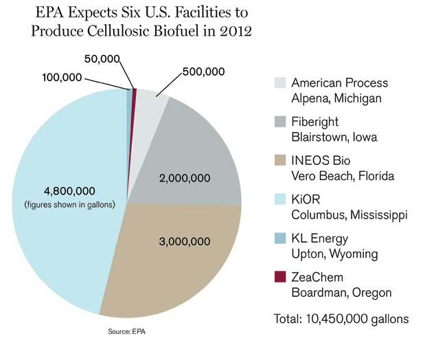 2012年,環(huán)境保護(hù)局認(rèn)為,根據(jù)它的分析,有六套設(shè)備今年計劃上線,這一新生產(chǎn)業(yè)的產(chǎn)能接近1050萬加侖,相比之下,初定的目標(biāo)是5億加侖。上面的圖表也表明:根據(jù)公司和設(shè)施情況,環(huán)保局下調(diào)了預(yù)測,就是對2012年纖維質(zhì)生物燃料產(chǎn)量的預(yù)測。