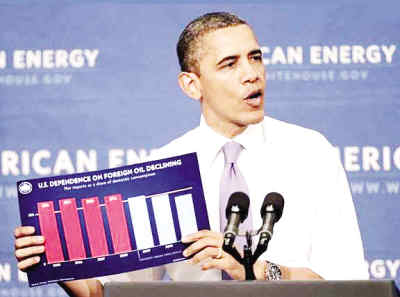 中國儲能網(wǎng)訊:美國總統(tǒng)奧巴馬手持圖表,“標(biāo)題是美國對外國石油進(jìn)口依賴正在減小”。