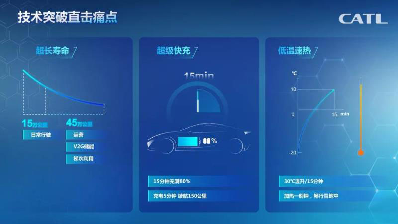 另一個(gè)關(guān)鍵技術(shù)是超長壽命。15萬公里,通常都是私家車的使用壽命,那我們?yōu)槭裁匆龅?0萬公里呢?因?yàn)槭O碌?5萬公里可以用來運(yùn)營,可以做V2G和電網(wǎng)互動(dòng)創(chuàng)造價(jià)值,可以梯次利用。電池循環(huán)壽命要做到夠長,經(jīng)濟(jì)性都可以不斷挖掘出來。在充電速度方面,我們開發(fā)了超級快充電池,在保證高能量密度、高安全、長壽命的基礎(chǔ)上,可以在15分鐘內(nèi)充滿80%,相當(dāng)于充電5分鐘可行駛150公里。這是用特殊石墨體系實(shí)現(xiàn)的快充。