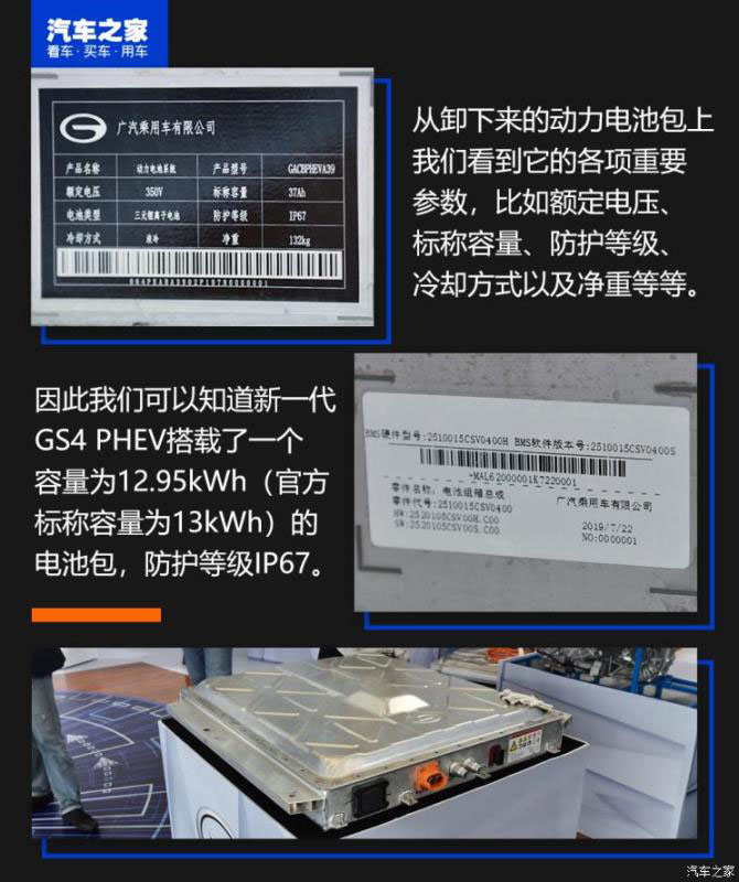 新一代GS4 PHEV采用了寧德時代供應的三元鋰離子電池,電池包(Pack)外殼采用鋁合金材質,既能做到輕量化又有利于保護環(huán)境,電池包內(nèi)部包含8個模組(Module),每個模組由12個電芯(Cell)組成,電池能量密度達到165Wh/kg。除此之外,我們還能看到模組旁邊的“電池控制單元”和“DPU電池高壓執(zhí)行單元總成”,前者負責控制電池包的輸出/輸入信號,后者負責將電池包的高壓電輸出以及輸入,至于我們看到的橙色線束,則是低壓通訊線束以及高壓匯流排。