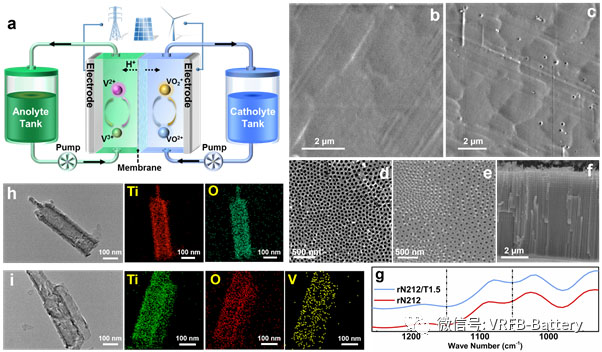 圖1 釩電池示意圖、TiO2納米管和Nafion/TiO2納米管復合膜形貌與結構