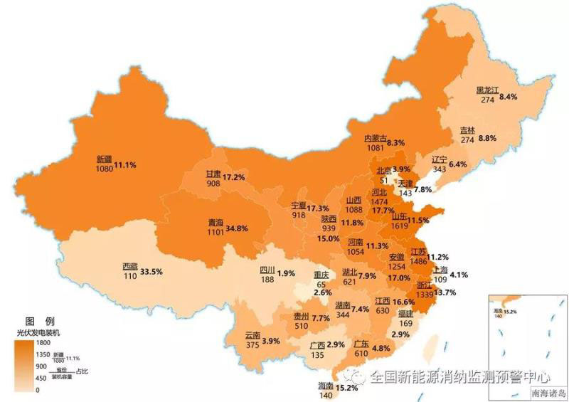 全國各省光伏裝機(jī)的滲透率在1.9%~34.8%之間。最低的是四川省,最高的是青海省。