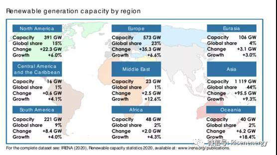 到2019年底為止,各大洲的可再生能源裝機(jī)容量、在全球占比、2019年增量、增速如下圖所示: