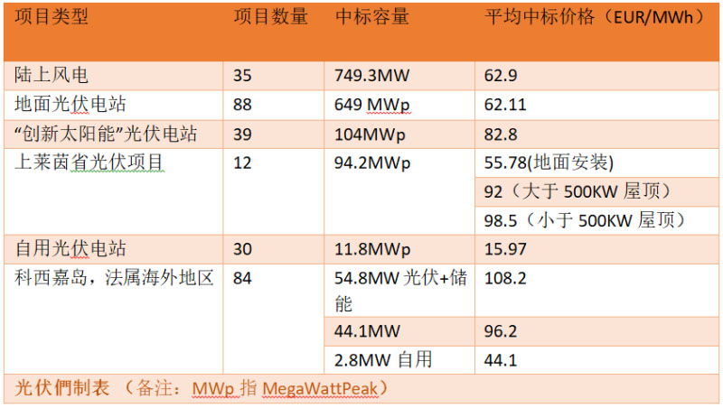 4月初,法國(guó)生態(tài)轉(zhuǎn)型部長(zhǎng)伊麗莎白.伯恩(Elisabeth Borne)宣布,近期招標(biāo)共分配了288個(gè)光伏和風(fēng)能項(xiàng)目,總?cè)萘繛?.7GW,這些項(xiàng)目一旦投運(yùn)可以每年生產(chǎn)2.6 TWh的電力。其中253個(gè)為太陽(yáng)能項(xiàng)目,約有88個(gè)大型光伏項(xiàng)目,總裝機(jī)量為649MWp,平均電價(jià)為62.11歐元/MWh。