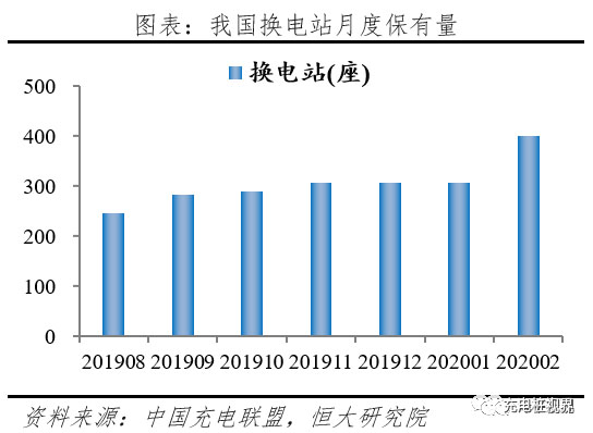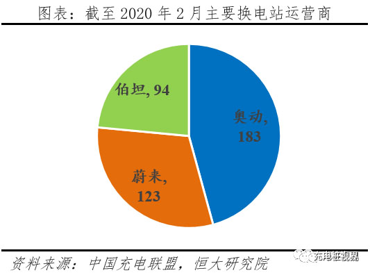 公共充電領(lǐng)域,慢充所需時(shí)間長,快充存在安全隱患且導(dǎo)致電池衰減嚴(yán)重等問題;相比公共充電而言,換電模式可迅速補(bǔ)充能源,解決里程和充電焦慮并降低購置成本。但是換電模式缺點(diǎn)也很明顯,建站成本高、電池規(guī)格難統(tǒng)一,無法解決電池所有權(quán)問題;所以換電模式比較適合在公交車和運(yùn)營車上使用,因?yàn)閮烧邩?biāo)準(zhǔn)化程度高,而且對運(yùn)營效率要求更嚴(yán)。在私家車領(lǐng)域,由于定制化屬性強(qiáng),換電模式只適用自家車型,更適合有一定銷量規(guī)模的車企。據(jù)充電聯(lián)盟統(tǒng)計(jì),截至2020年2月,我國換電站保有量400座,相比2019年8月245座增加63.3%;主要運(yùn)營商有三家,奧動(dòng)、蔚來、伯坦分別運(yùn)營183、123、94座。